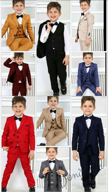 - Комплектът включва официален панталон в бордоо, сако в бордо,ризка в бяло,елек и папионка.