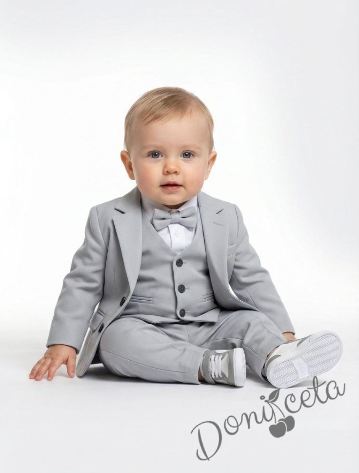 Официален бебешки костюм в сиво за момче от 4 части елек, риза в бяло, панталон и папийонка Сивина