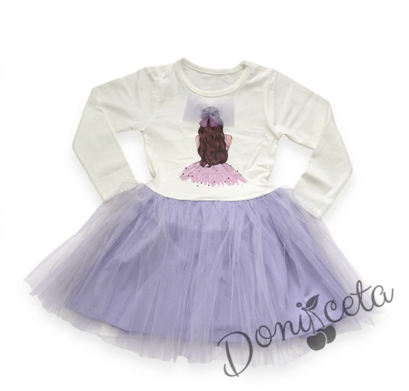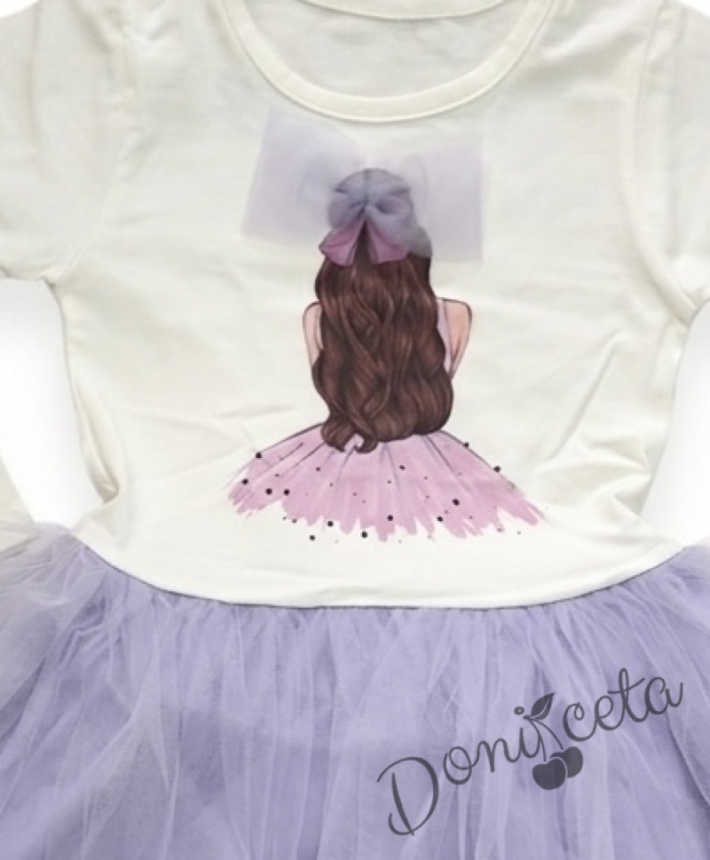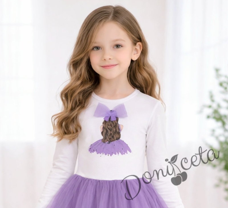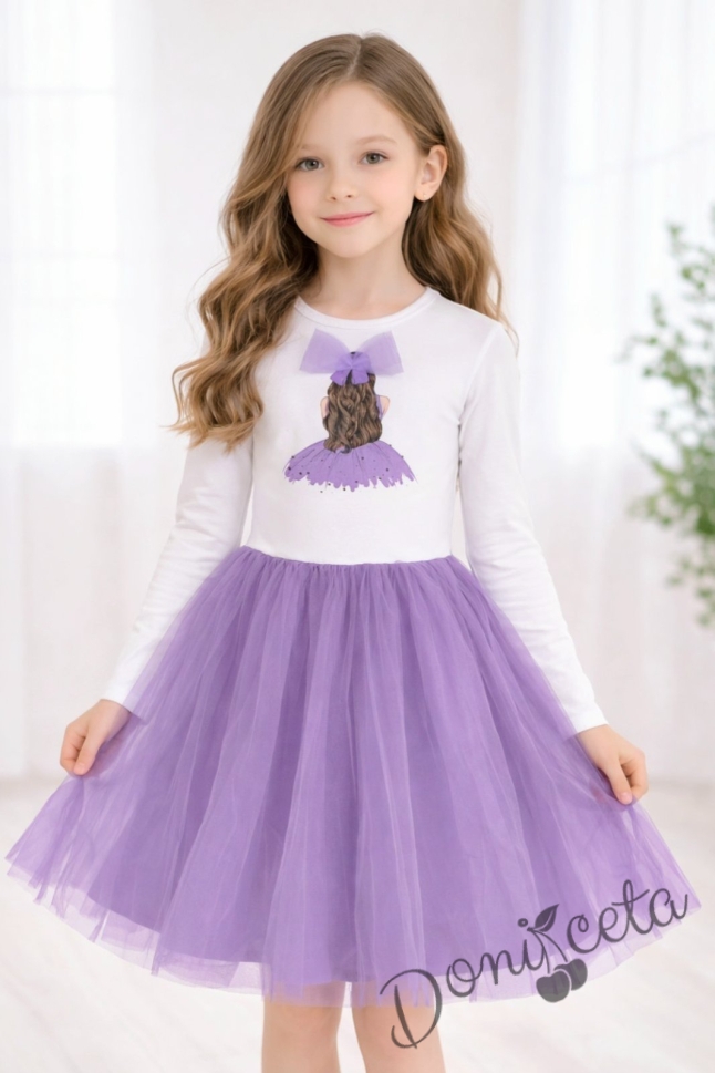 Детска ежедневна рокля с дълъг ръкав в лилаво с красива картинка с момиченце