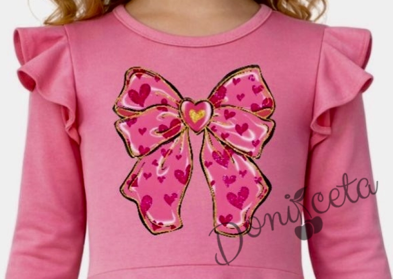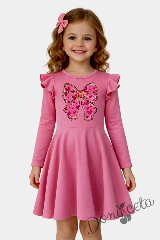Детска рокля с дълъг ръкав в циклама с къдрички и панделка