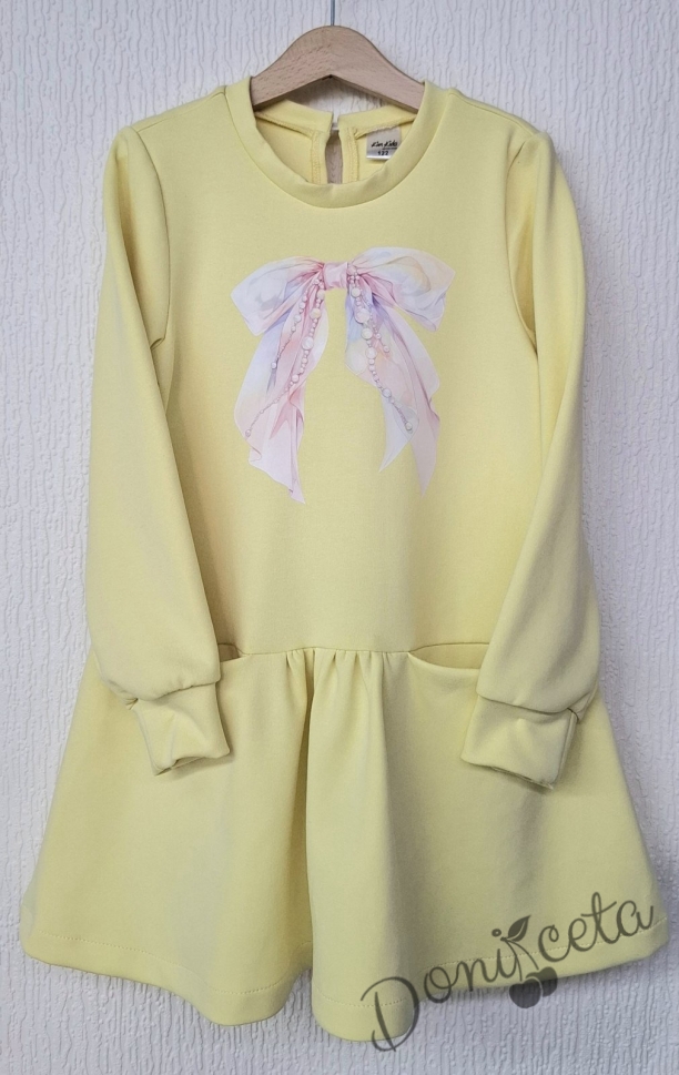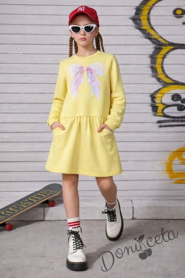 Детска спортна рокля с дълъг ръкав в жълто с джобчета