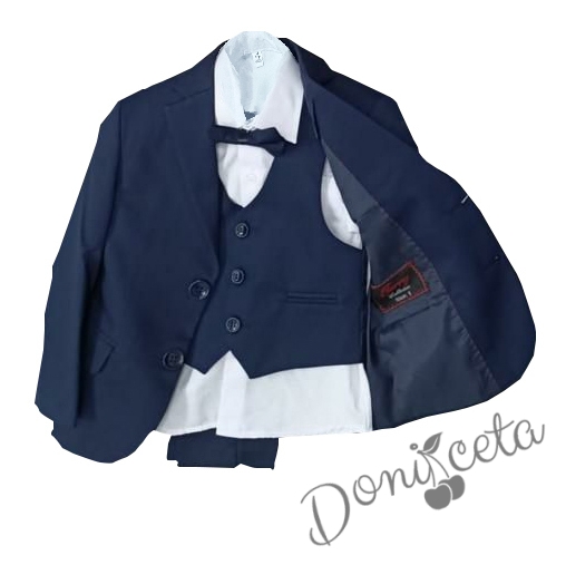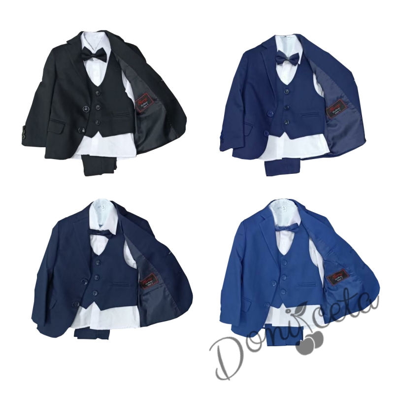 - Комплектът включва официален панталон в тъмносиньо, сако, ризка в бяло, елек и папионка.