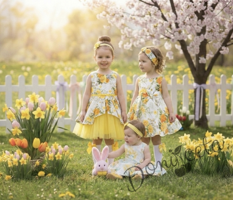 Детска официална рокля клош с жълти цветя с тюл Надежда