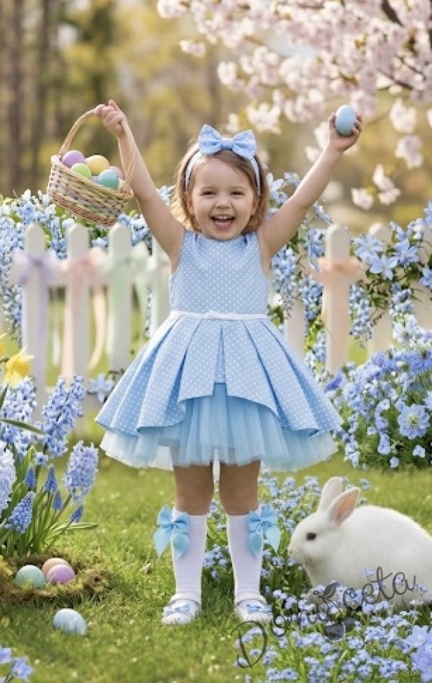 Представяме ви очарователната детска официална рокля "Надежда" в нежен светлосин нюанс на точки, перфектният избор за специални поводи и празнични моменти на вашата малка принцеса!