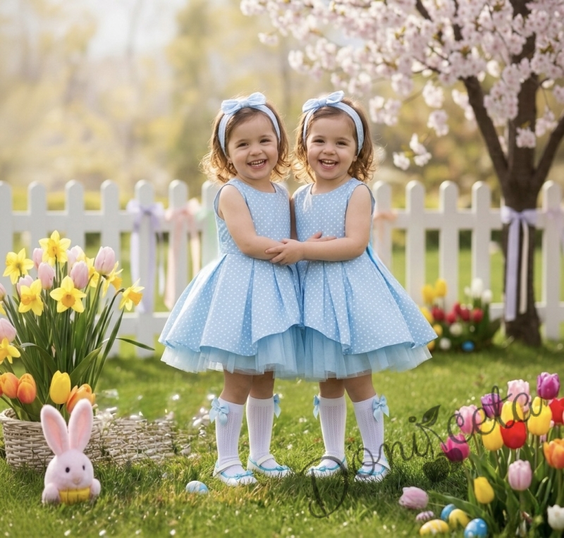 Представяме ви нашата очарователна детска официална рокля, създадена да превърне всяко момиченце в истинска принцеса! Тази светлосиня рокля на точки е перфектният избор за специални поводи, където искате вашето дете да изглежда елегантно и стилно.
