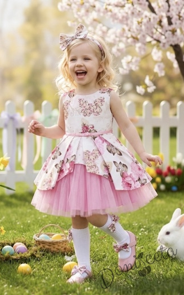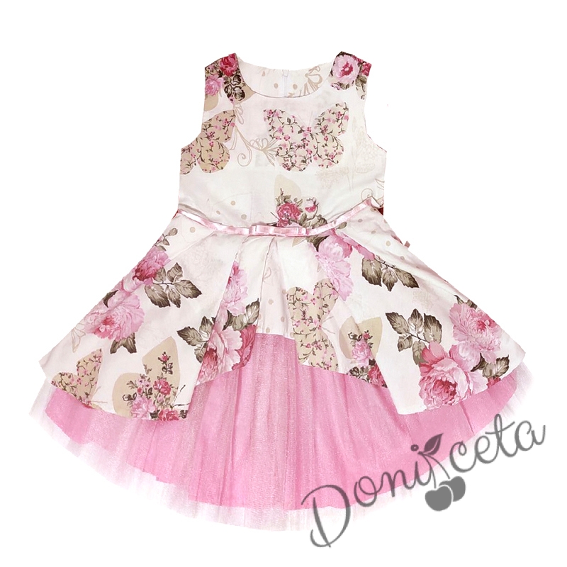 Детска официална рокля Надежда с розови цветя тип клош с тюл в розово