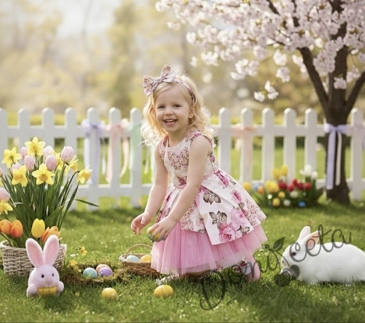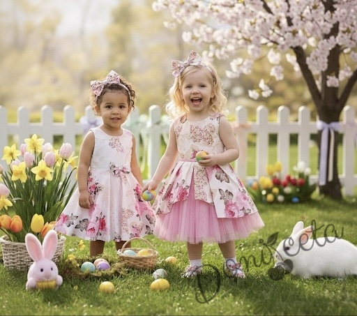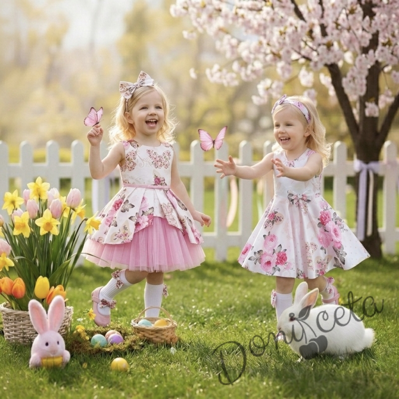 Начало МОМИЧЕТА Детска официална рокля Надежда с розови цветя тип клош с тюл в розово