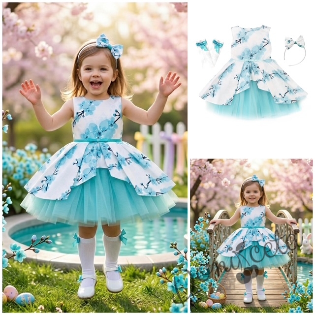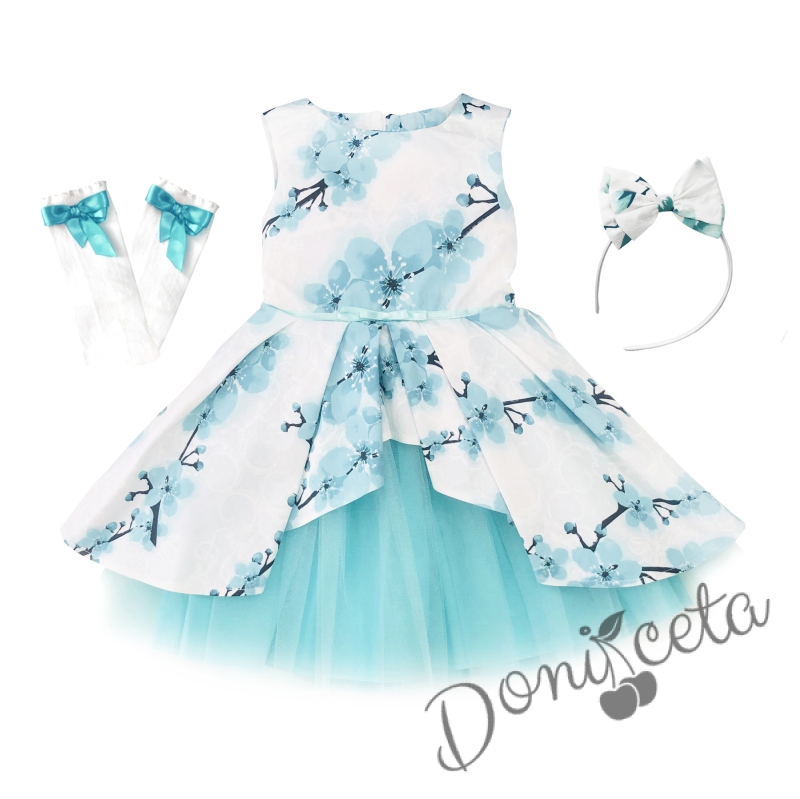 - Много красива детска официална рокля с богат тюл на нежни тюркоазени цветя с диадема и чорапи в бяло с панделка.