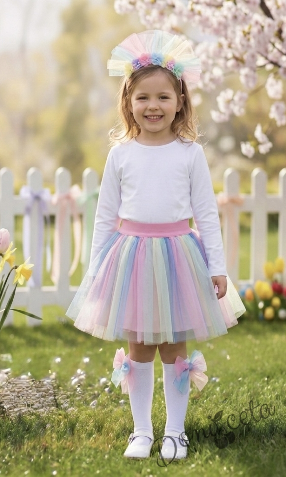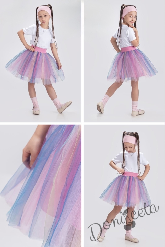 Изработена от фин тюл, тази пола е истинска феерия от цветове. Нежните нюанси на розово, синьо, жълто и лилаво се преливат един в друг, създавайки зашеметяващ ефект. Блестящите нишки, вплетени в тюла, добавят допълнителна доза блясък и правят полата идеална за специални поводи или просто за да озарите деня на вашето дете.