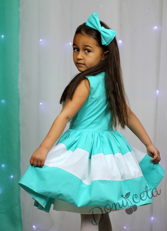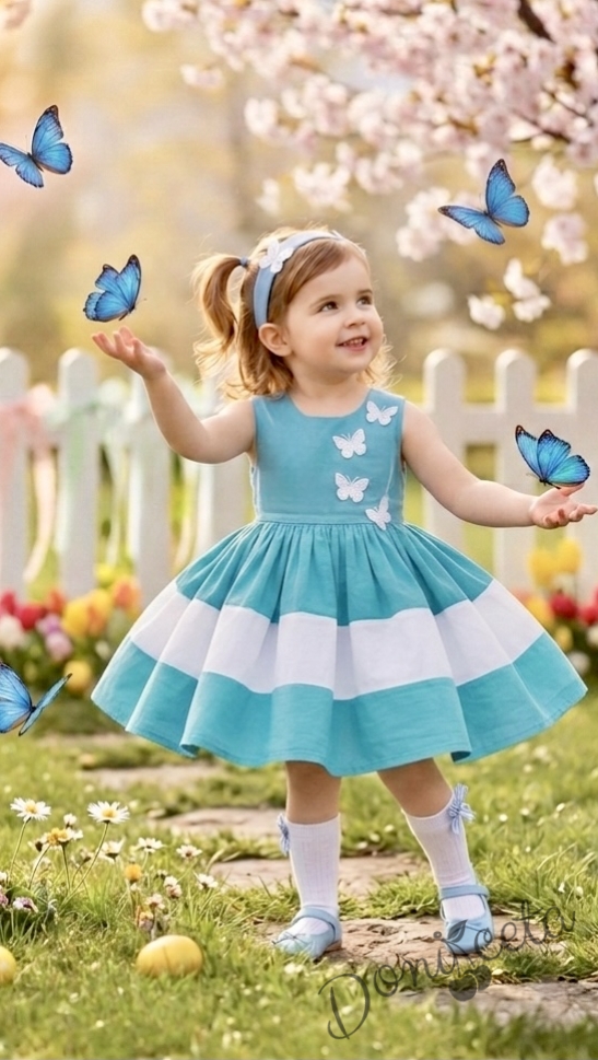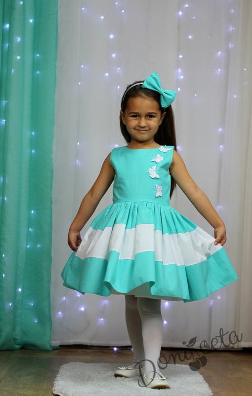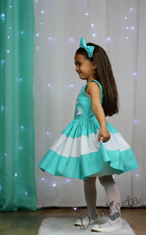 - Изключително стилна детска рокля в ттюркоаз/мента и бяло с 3 D пеперуди.