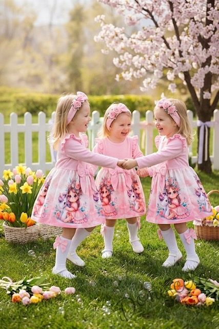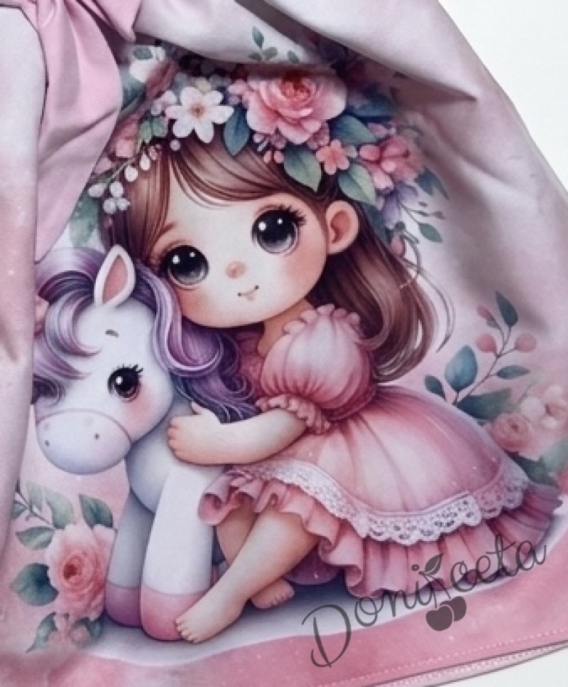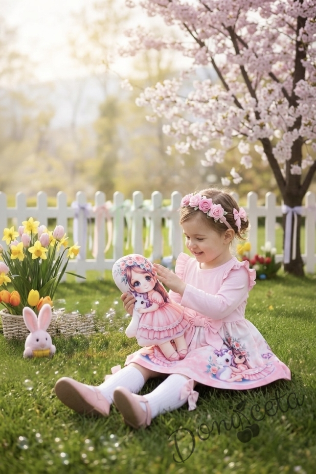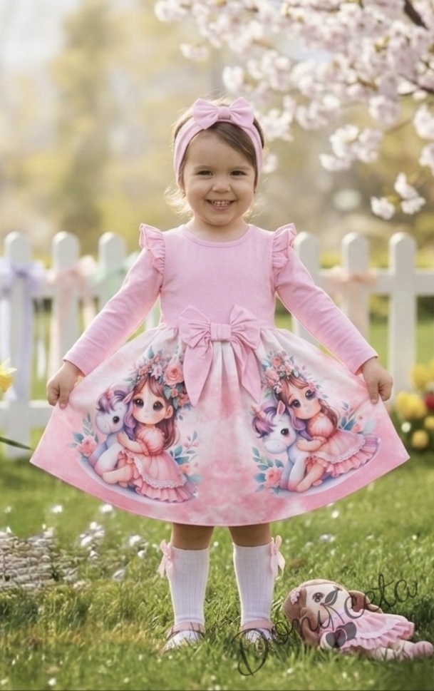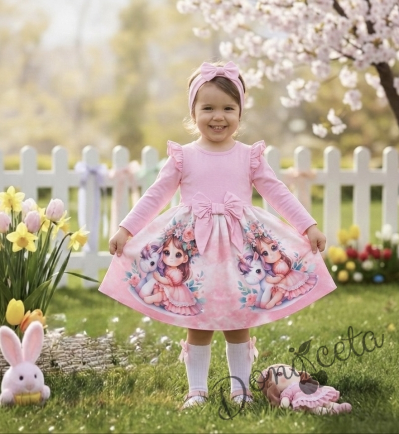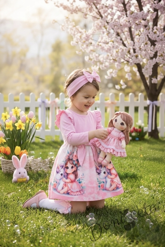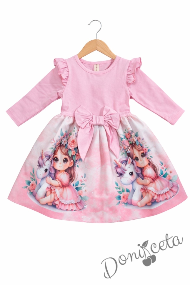 Детска рокля с дълъг ръкав в розово с къдрички, панделка и картинка на момиченце