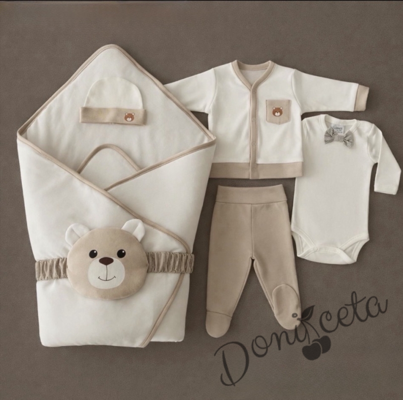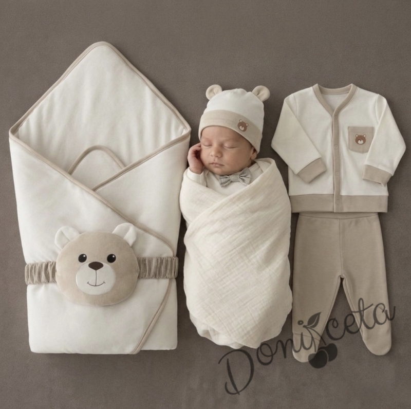 Луксозен бебешки комплект за изписване за момче в бежово и екрю с мече