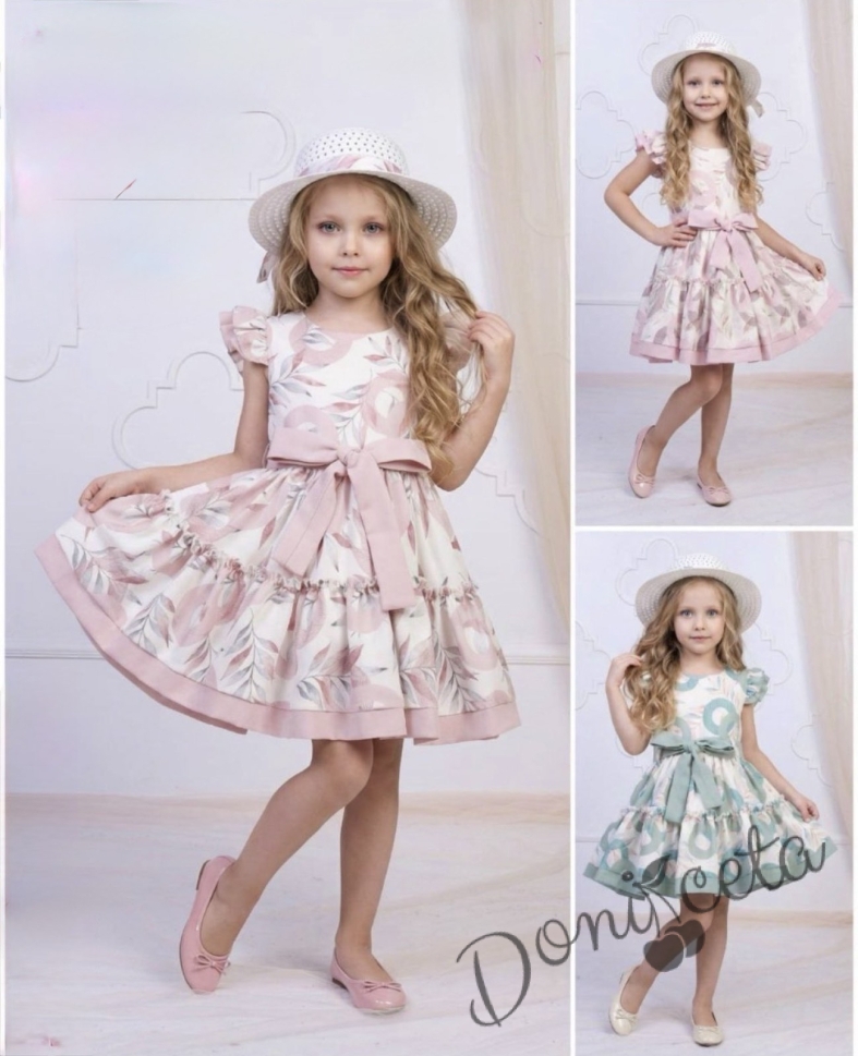 • Изключително красива детска рокля в екрю с красив флорален принт с мотиви на листа и абстрактни форми в розова пудра, придаващ усещане за ефирност.