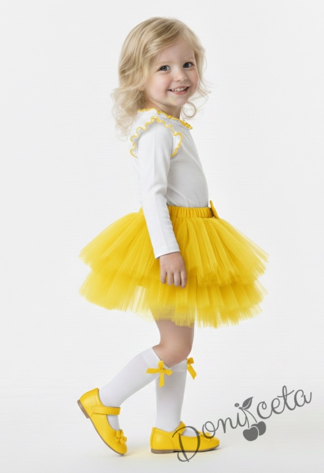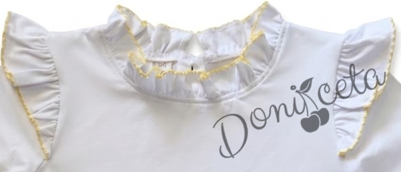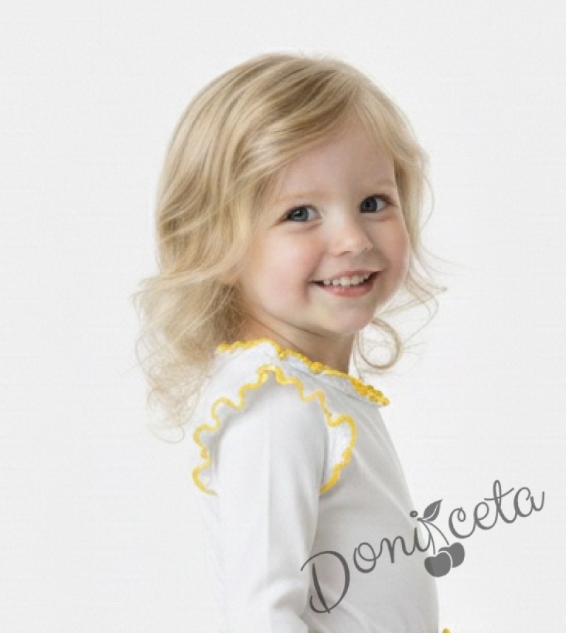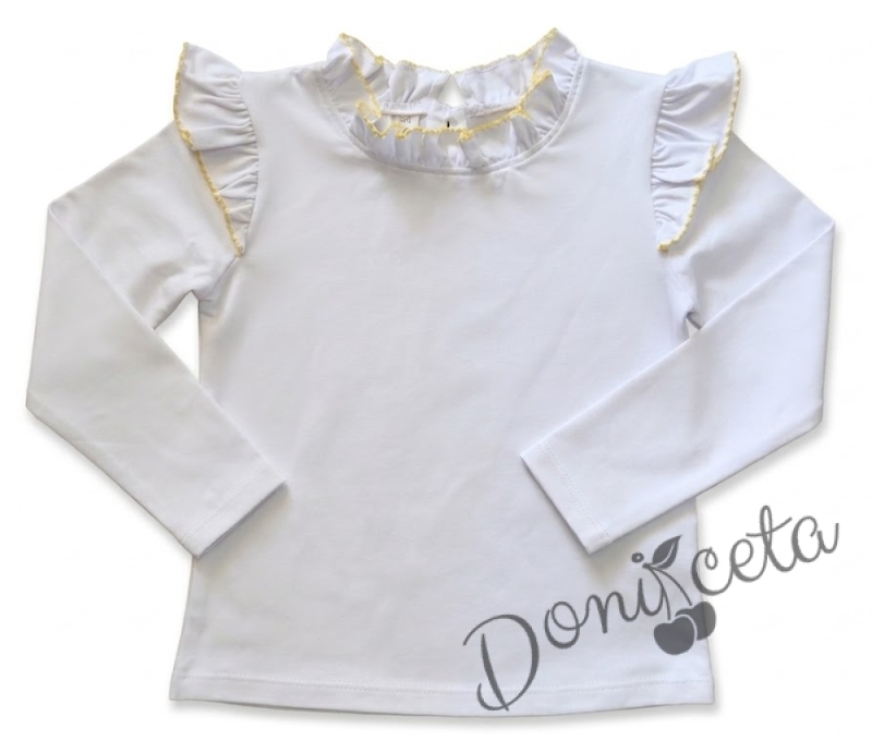 - Детска блуза с дълъг ръкав в бяло с къдрички с жълт кант, което допълва и завършва бялата блуза.