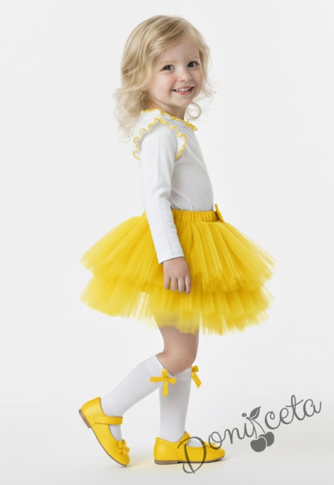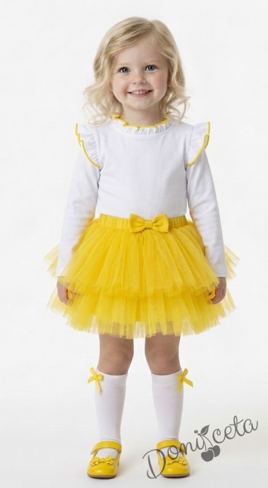 Весел комплект от поличка тип пачка в жълто от тюл с блузка с дълъг ръкав в бяло с къдрички на рамената и бието в жълто.