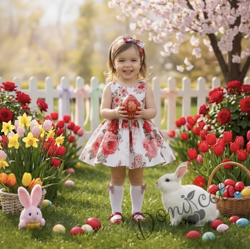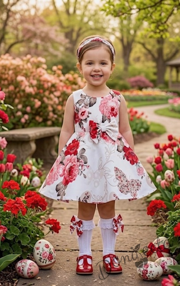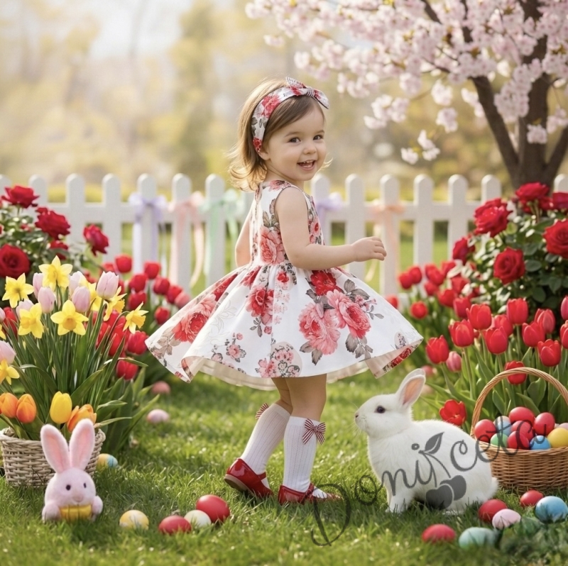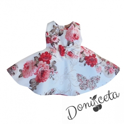Детска или бебешка рокля в бяло с цветя в червено клош Вилина