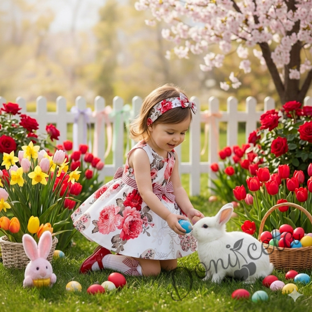 Начало МОМИЧЕТА Детска или бебешка рокля в бяло с цветя в червено клош Вилина