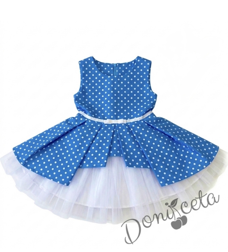 Детска рокля памучна рокля Надежда в синьо на точки с тюл в бяло