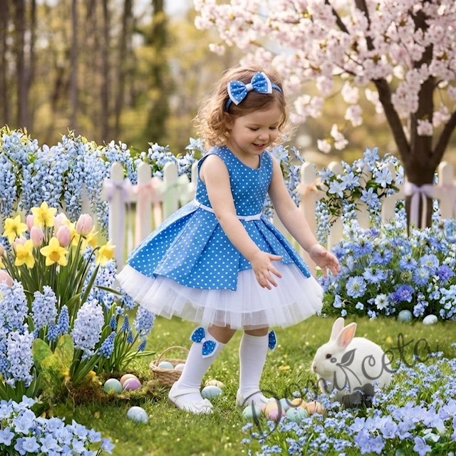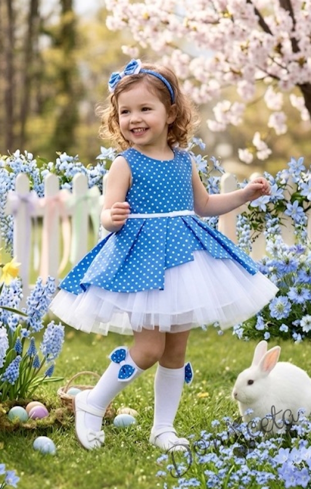 - Много красива детска официална рокля с богат тюл в синьо на точки.