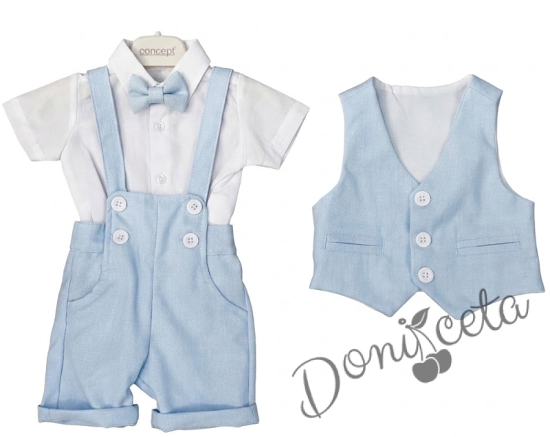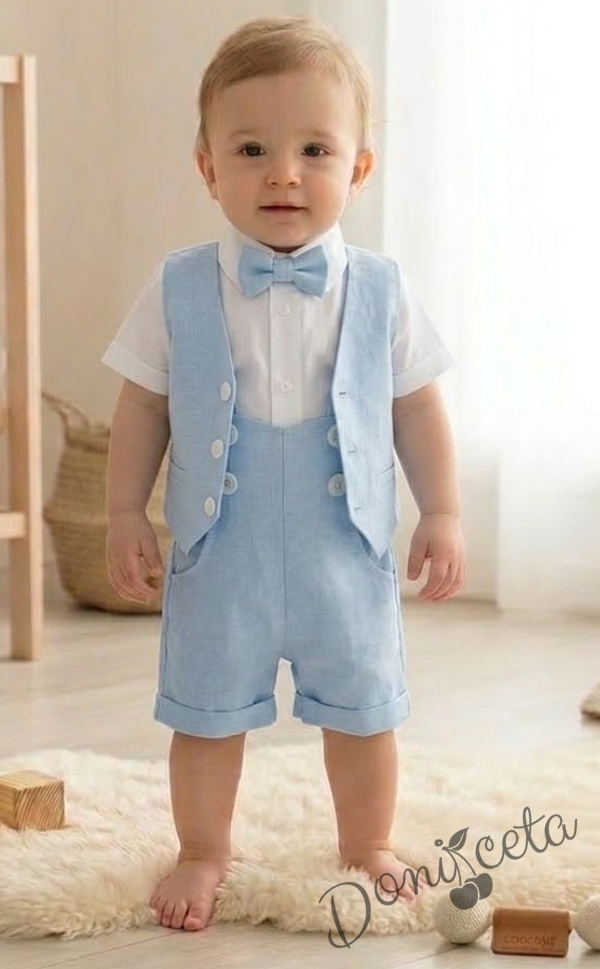 Летен комплект за момче в синьо от къси панталонки тип гащеризон, елек, папийонка и ризка в бяло с къс ръкав