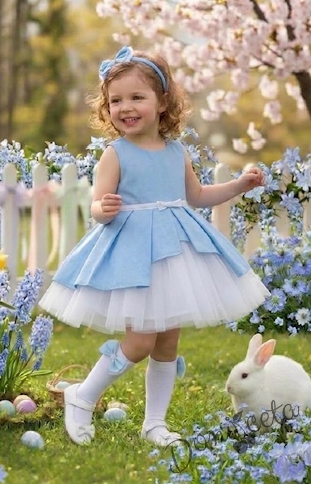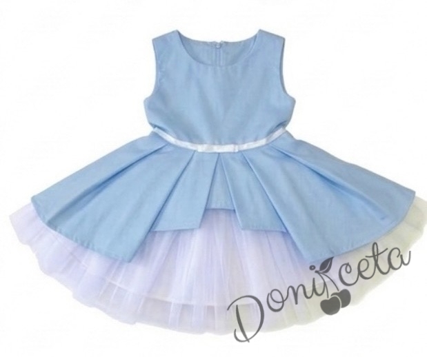 Детска памучна рокля Надежда в светлосиньо с тюл в бяло