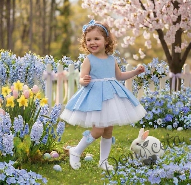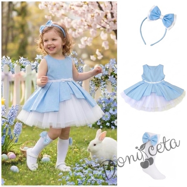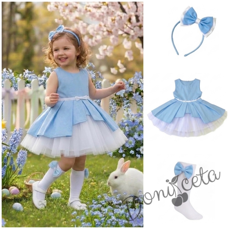 Комплект от 3 части- детска памучна рокля Надежда в светлосиньо с тюл, диадема за коса в синьо и чорапки в бяло с панделки