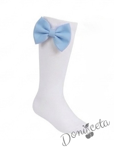 - Много красива детска официална рокля в светлосиньо с богат тюл в бяло на точки с диадема и чорапки.