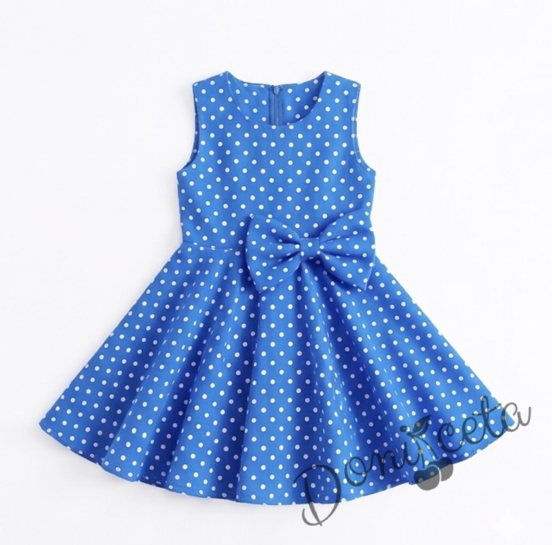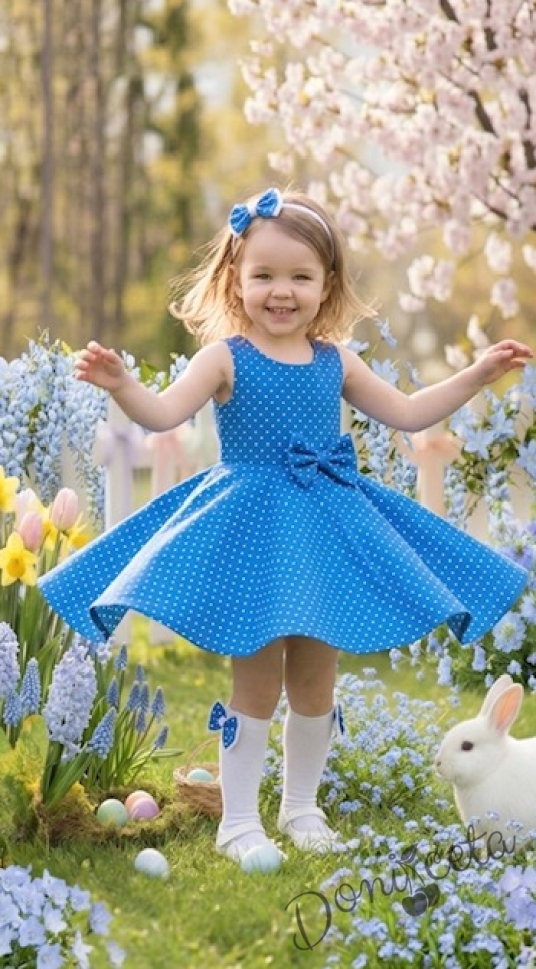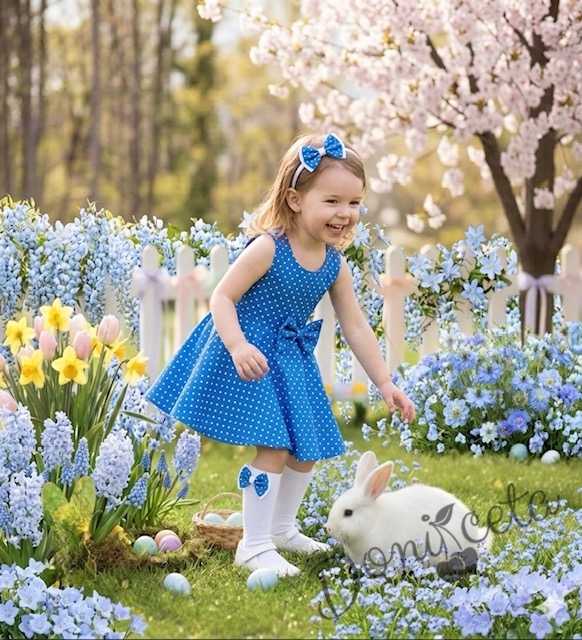 Ежедневна или официална детска рокля клош в кралско синьо на бели точки Вилина