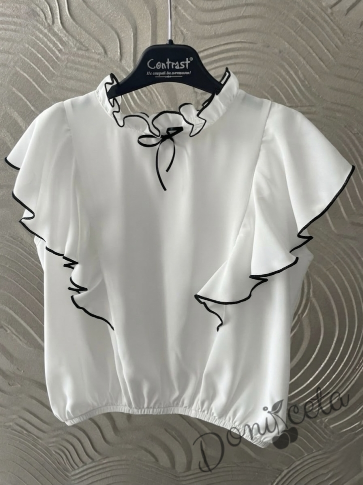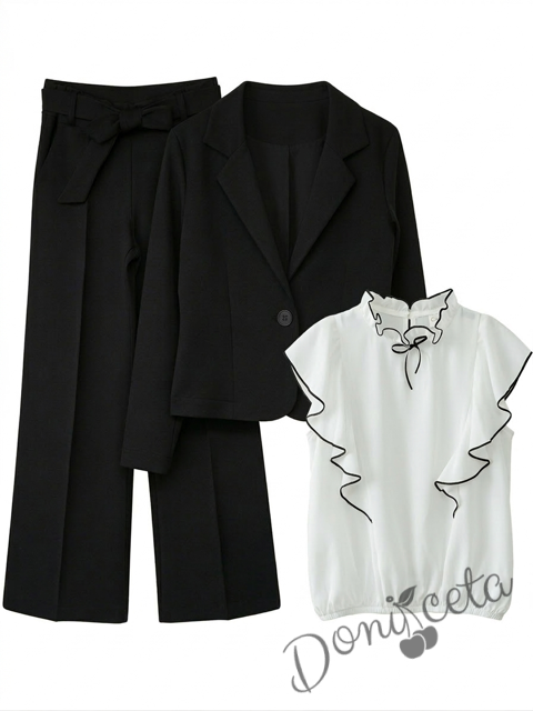 Комплект за момиче от 3 части - сако Ким, панталон с висока талия и коланче в черно и блуза без ръкав с панделка в черно