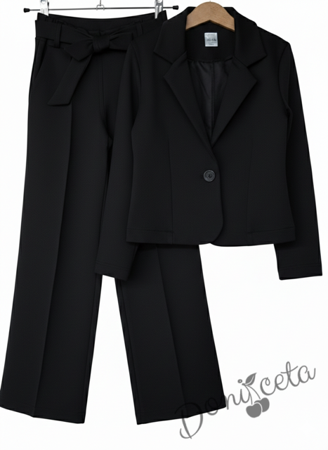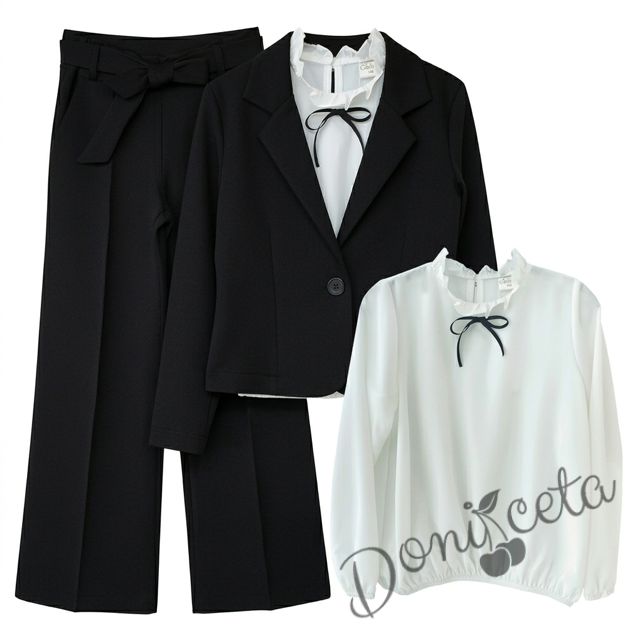 Комплект за момиче от 3 части - сако, панталон с висока талия и колан в черно и блуза с дълъг ръкав с панделка в черно