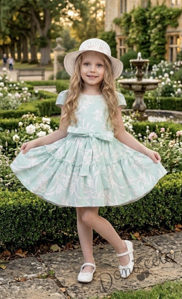 Детска рокля с флорални мотиви върху основа в цвят мента и аксесоар шапка