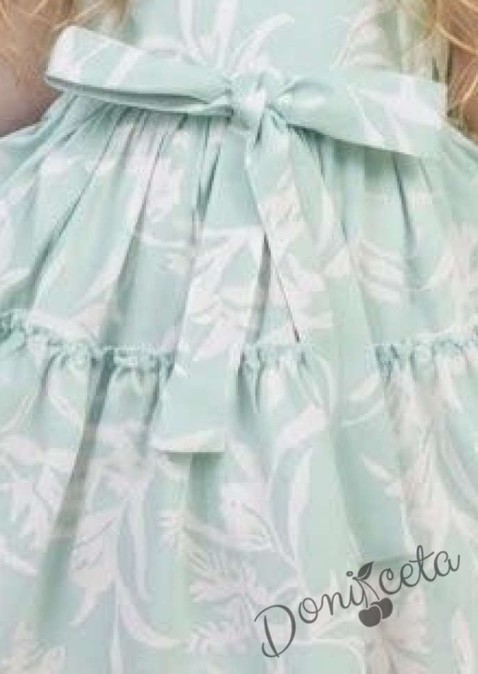 - Изключително красива детска рокля с флорални мотиви върху основа в цвят мента.