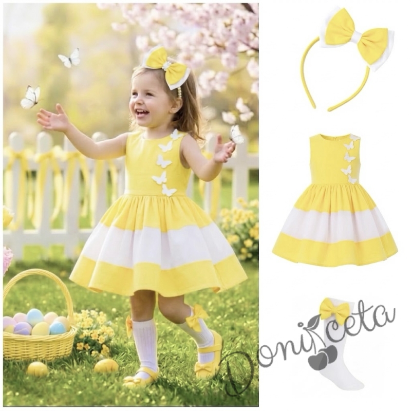 Комплект от детска рокля в жълто и бяло с 3D пеперуди Далента с диадема и чорапки