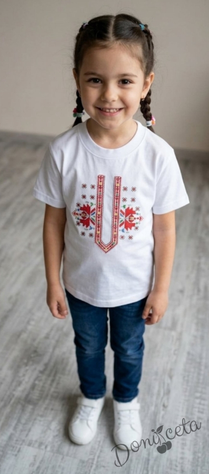 Детска тениска с къс ръкав с фолклорни/етно мотиви за момиче