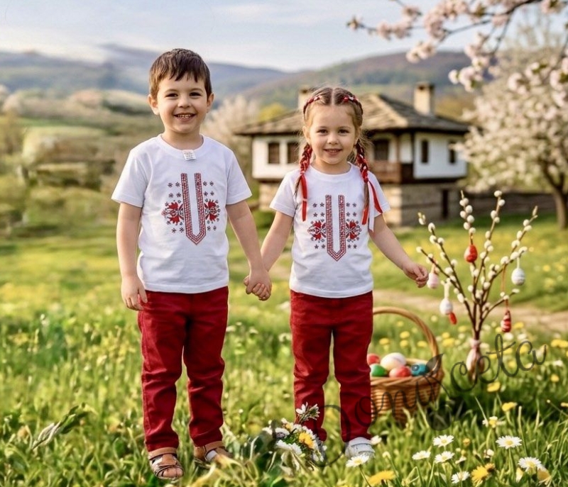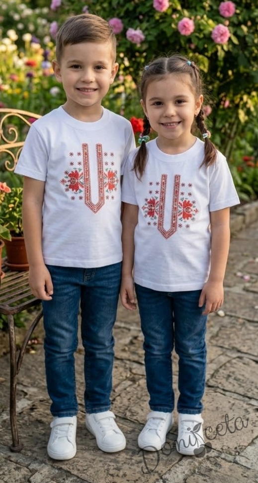 Добавете щипка традиция и стил в гардероба на вашето дете с тази прекрасна бяла тениска с етно елементи. Дизайнът съчетава модерния ежедневен комфорт с красотата на българската шевица, превръщайки я в идеален избор както за празници, така и за ежедневието.