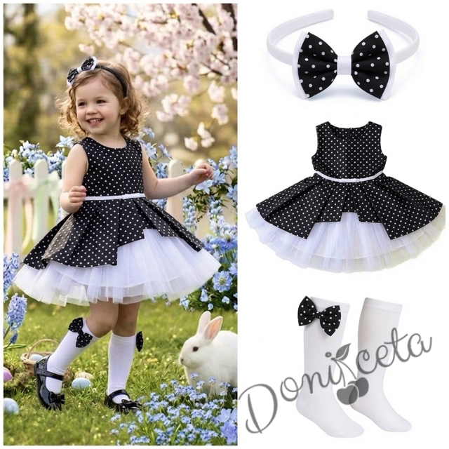 Комплект от 3 части- детска памучна рокля Надежда в черно на бели точки с тюл в бяло, диадема за коса на точки и чорапки в бяло с панделки