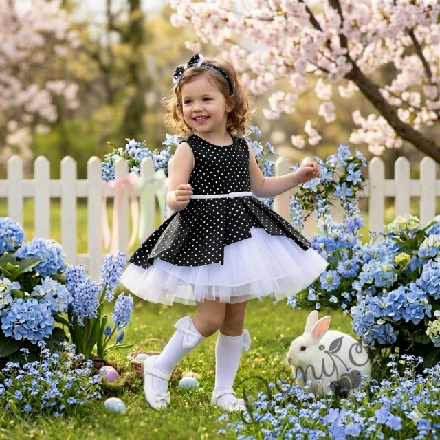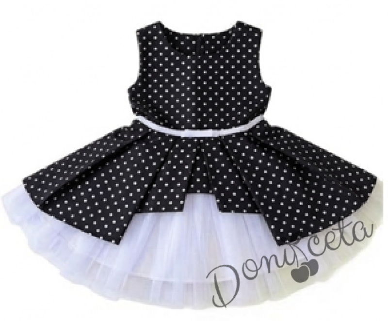 • Комплект от много красива детска официална или ежедневна рокля в черно с богат тюл в бяло на точки с диадема и чорапки.