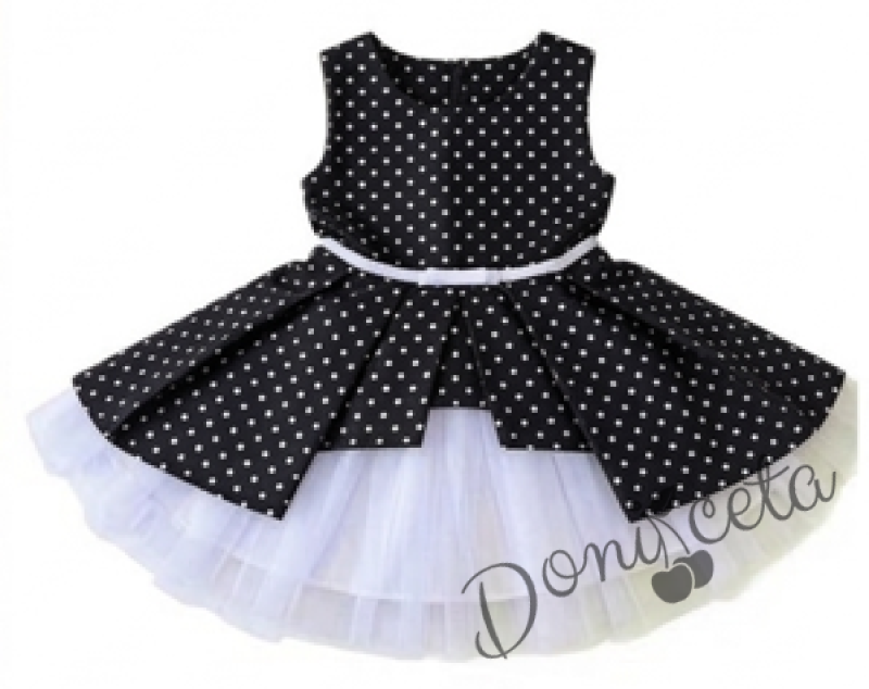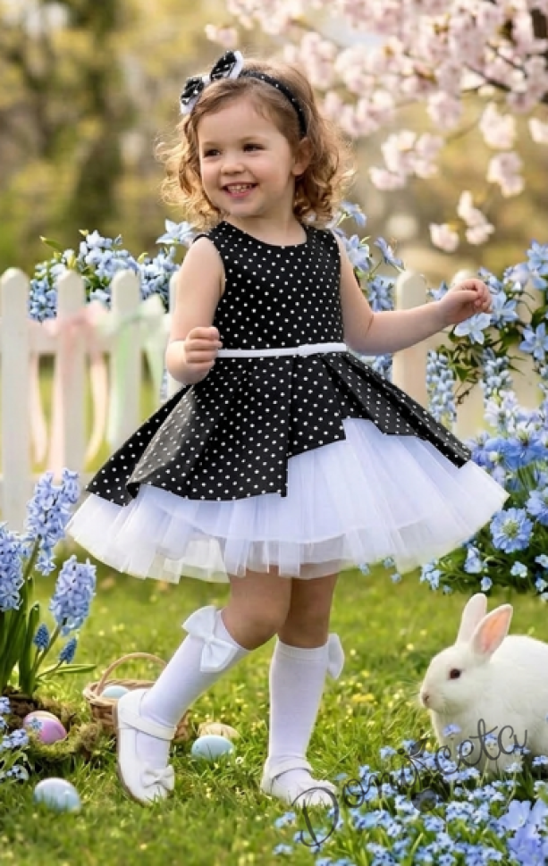 Детска официална рокля Надежда в черно на точки тип клош с тюл в бяло