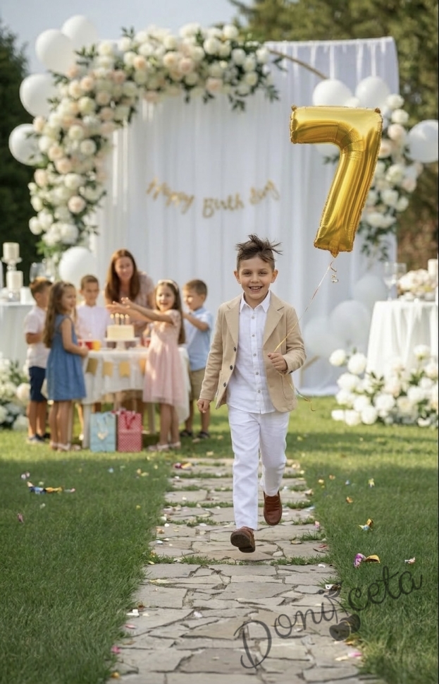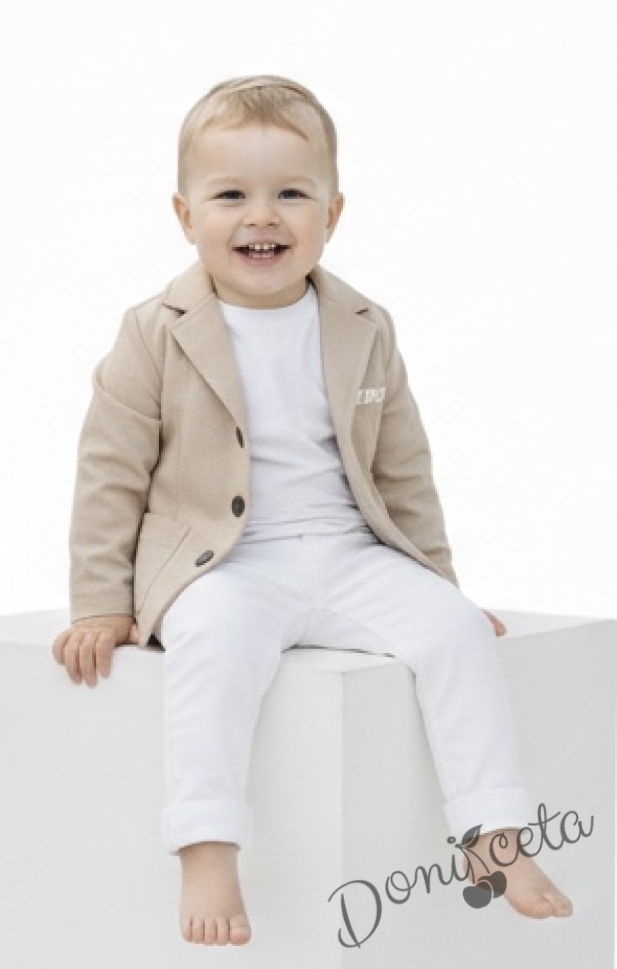Спортно-елегантен комплект за момче от 3 части - тениска с къс ръкав в бяло със сако и панталон в бежово от колекция Бежина