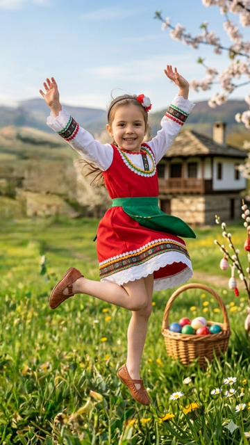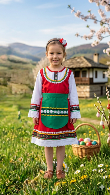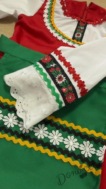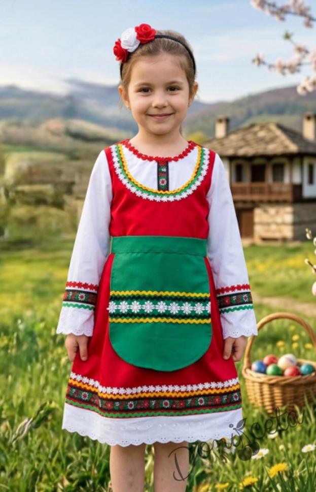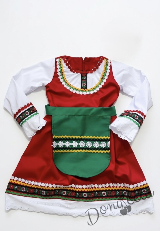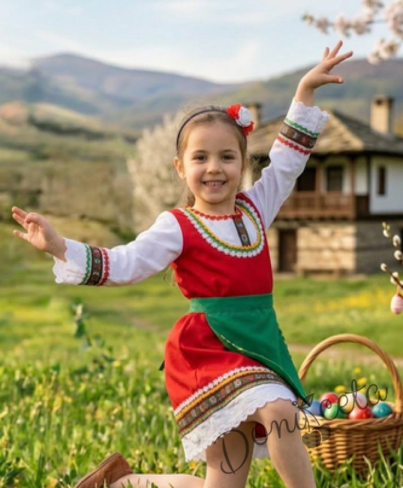 - Красив памучен фолклорен комплект за момиче от сукман, бели ръкавчета с красив шерит и престилка в зелено с етно мотиви.
