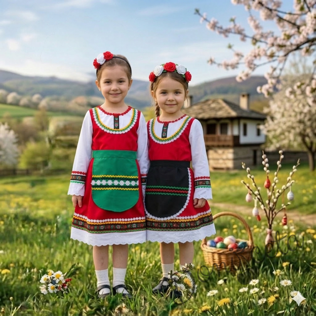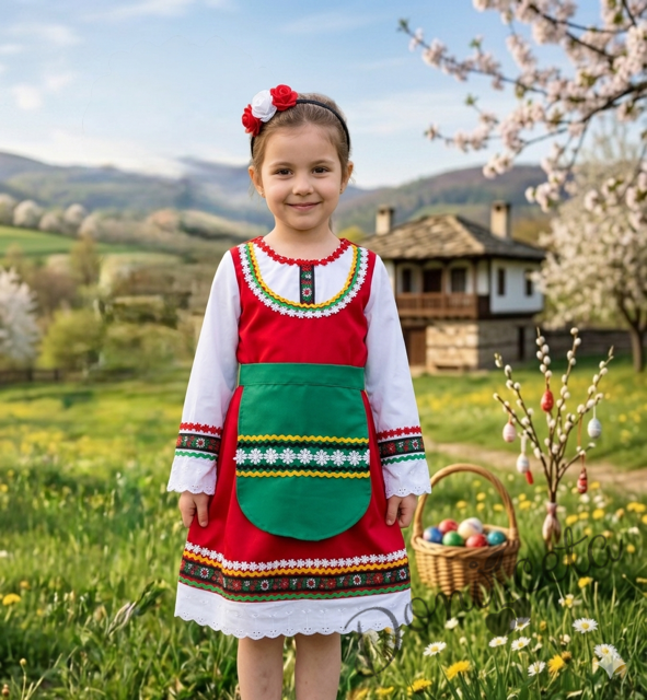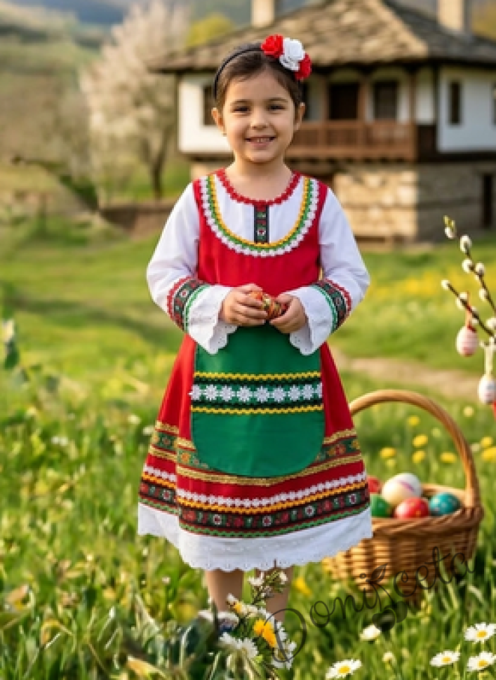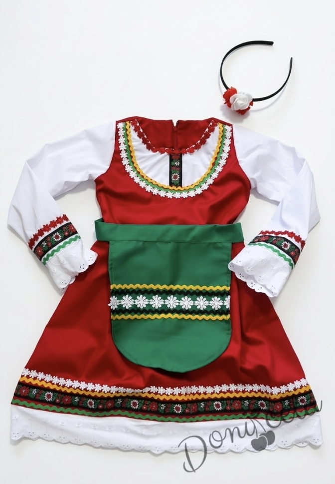 - Красив памучен фолклорен комплект за момиче от сукман в червено, бели ръкавчета с красив шерит и престилка в зелено с етно мотиви и диадема.