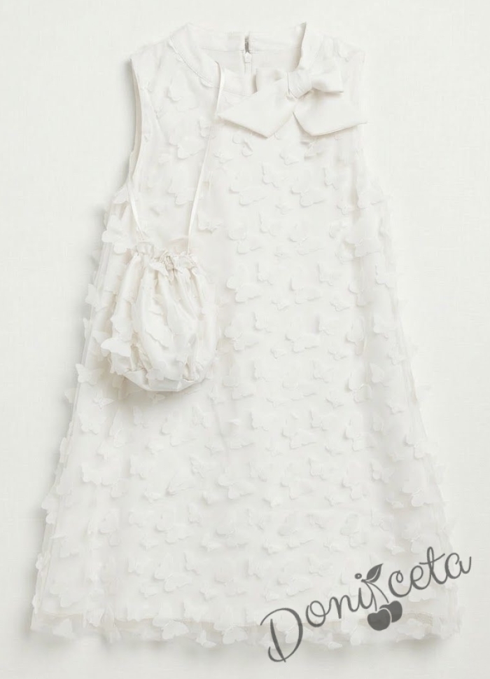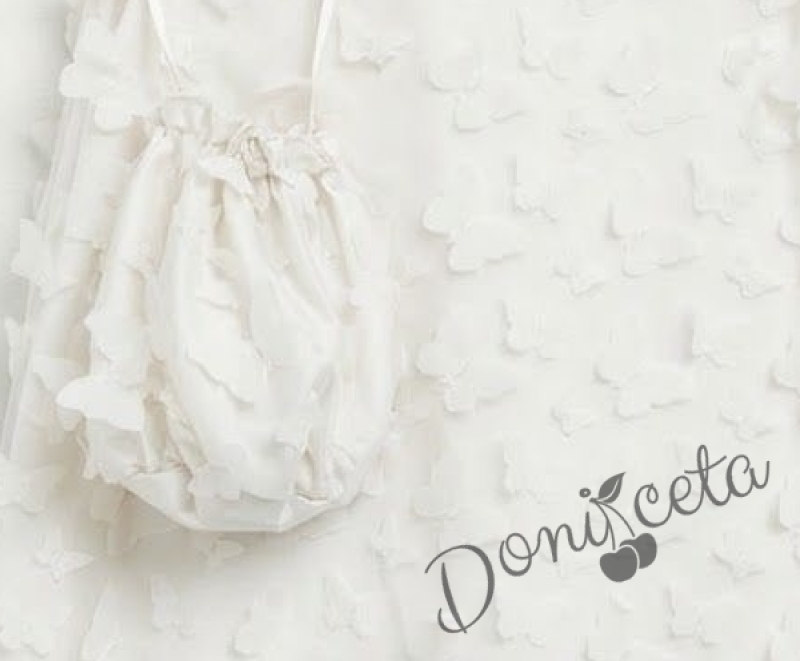Елегантна детска рокля с пеперуди , панделка в бяло и чантичка