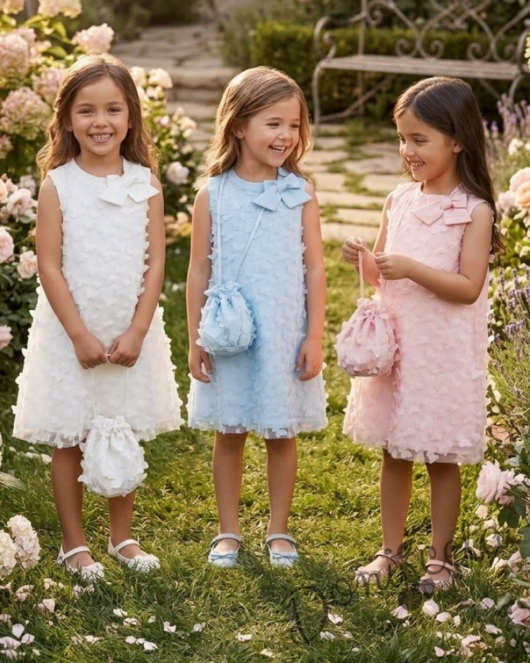 - Роклята е с класическа А-линия, която осигурява комфорт и свобода на движение. Отличава се с богата текстура, покрита с деликатни 3D елементи, наподобяващи пеперуди към роклята има кокетна чантичка тип „торбичка“ в същия цвят и със същите мотиви на пеперуди, която завършва визията по перфектен начин..