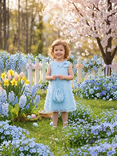 Елегантна детска рокля с пеперуди , панделка в светлосиньо и чантичка