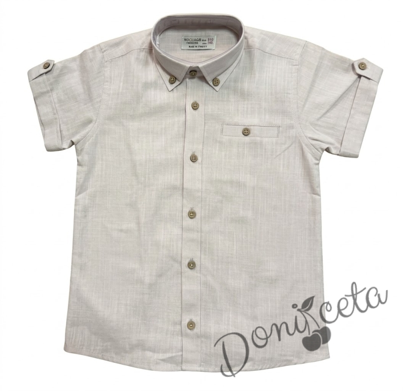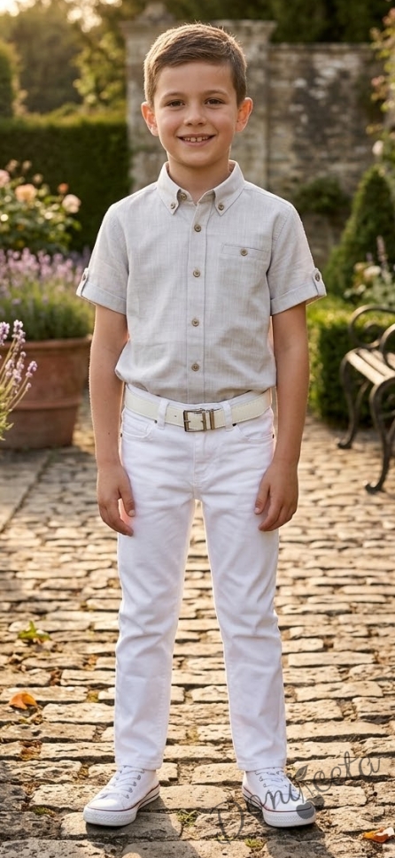 Комплект за момче състоящ се от бял панталон с колан и риза в бежов цвят