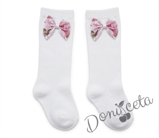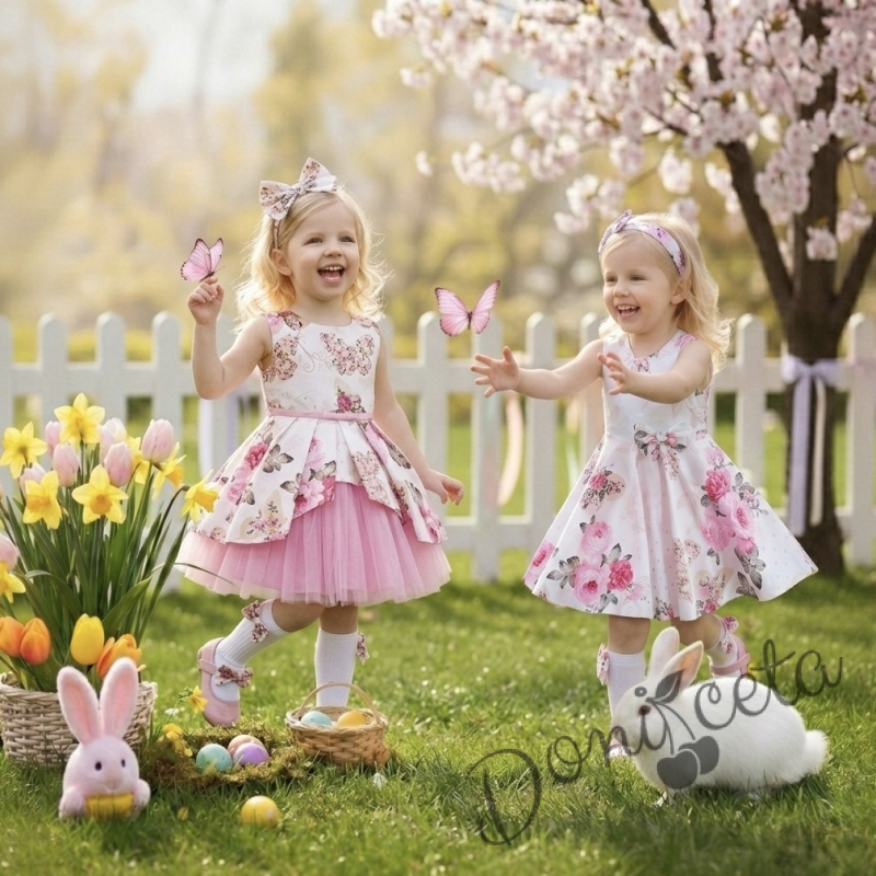 Комплект от 3 части- детска памучна рокля Надежда в розово с тюл, диадема за коса и чорапки в бяло с панделки