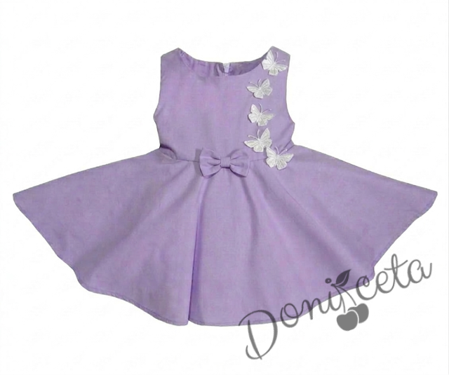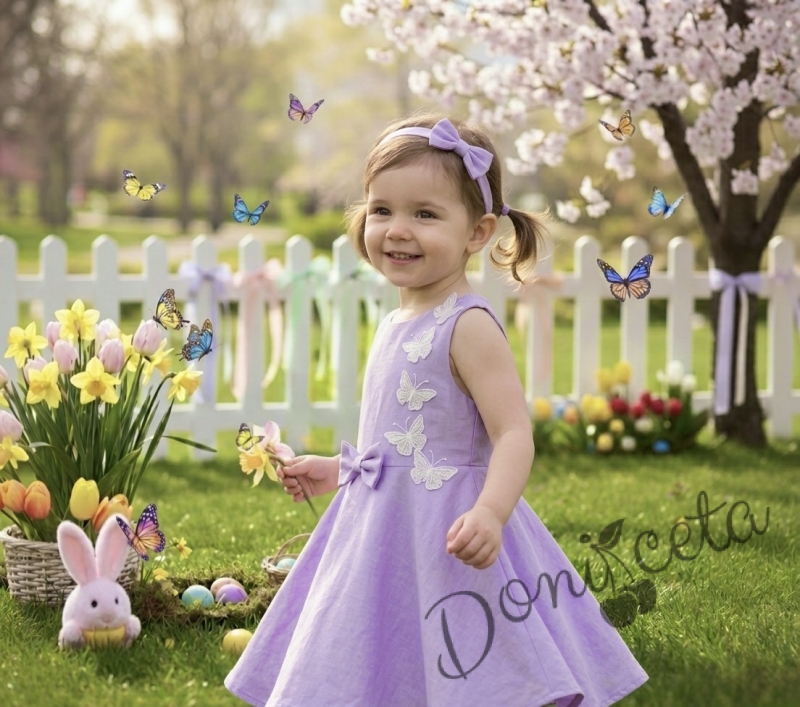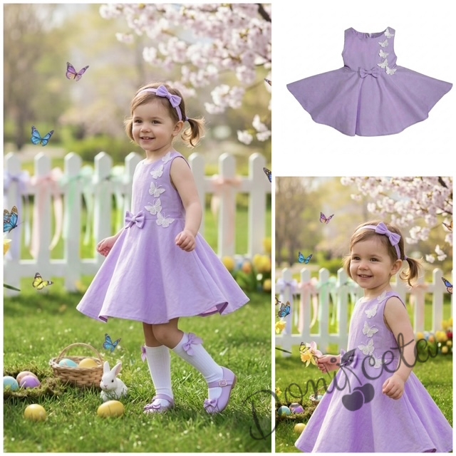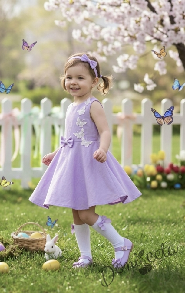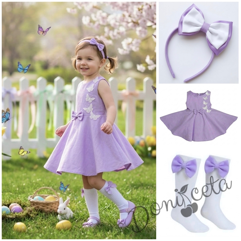 Комплект от 3 части-детска рокля клош в лилаво Вилина с бели 3D пеперудки, диадема и чорапки