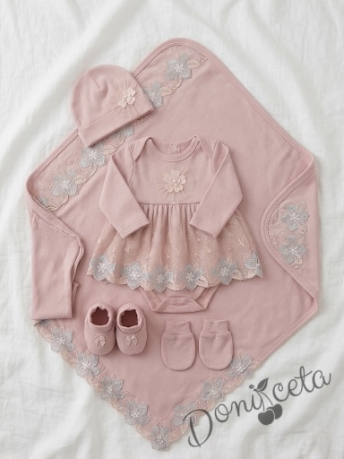 Комплект за изписване от 7 части за момиче в розово с бродерия и цвете
