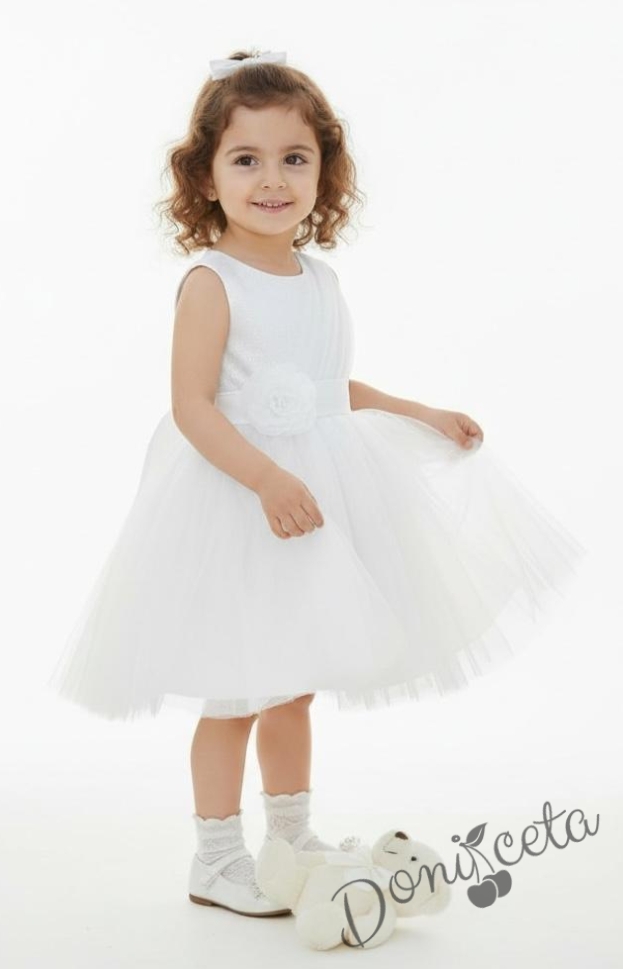 Официална детска/бебешка рокля в бяло с тюл и коланче с цвете на талията