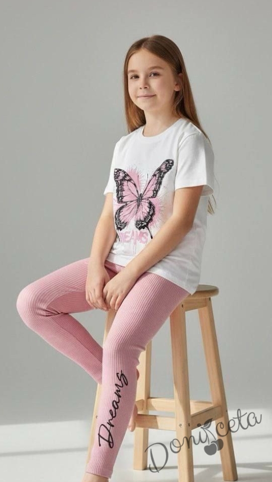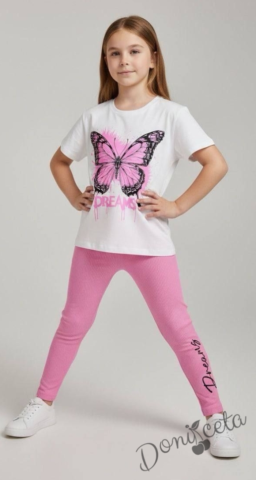Комплект за момиче от блузка с къс ръкав в бяло с пеперуда в розово и клин